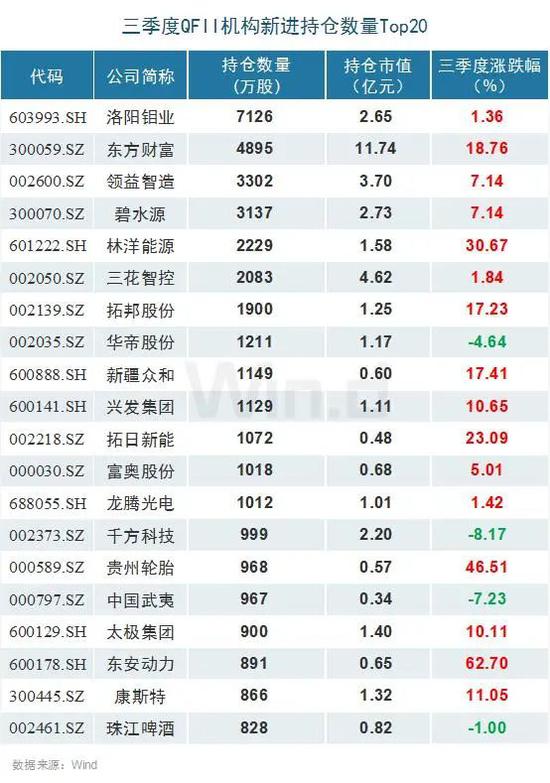 已公布三季报的个股中,QFII现身379只个股前十大股东榜单中。其中241股为三季度新进持股。洛阳钼业、东方财富、领益智造、碧水源、林洋能源等13只个股的持仓量均在千万股以上。