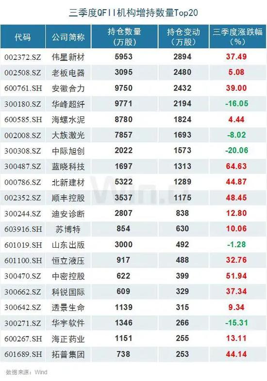 另外,三季度QFII增持55股,其中,伟星新材、老板电器、安徽合力、华峰超纤、海螺水泥、大族激光、中际旭创、蓝晓科技、北新建材、顺丰控股10只个股增持数量均在千万以上,建材股居多。