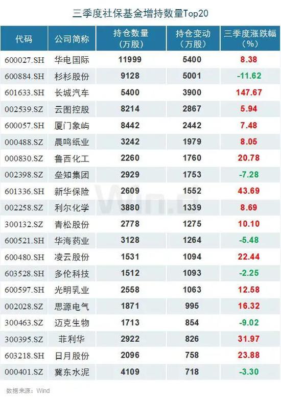 三季报显示,截至10月29日,已公布三季报的个股中,共有337只个股获社保基金持仓,新进持股96只,79只个股获得增持,其中华电国际、杉杉股份、长城汽车增持数量居前,分别达5400万股、5001万股、3900万股;此外长城汽车、云图控股、厦门象屿、晨鸣纸业、鲁西化工、垒知集团、新华保险、利尔化学、青松股份、华海药业、凌云股份、多伦科技、光明乳业等13只个股增持数量均超千万股。