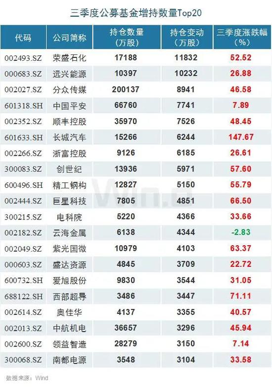 三季度公募基金增持股中,荣盛石化、远兴能源两家公司基金增持数量均在亿股以上。