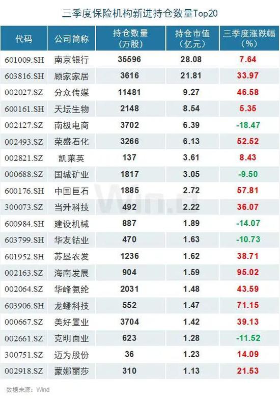 新进个股方面,截至目前,显示三季度获得险资机构新进持仓的个股数量已达73只,其中南京银行、顾家家居持仓市值均超20亿元,分众传媒、天坛生物、南极电商、荣盛石化持仓市值均超5亿。