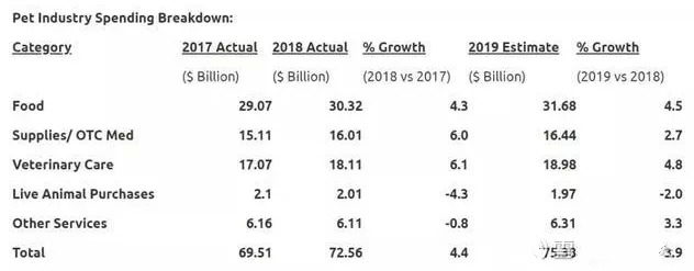根据美国APPA的数据,2018年美国宠物食品的销售额大约为303.2亿美元,相当于2000亿人民币左右的市场,我们现在的宠物食品市场有多大呢?