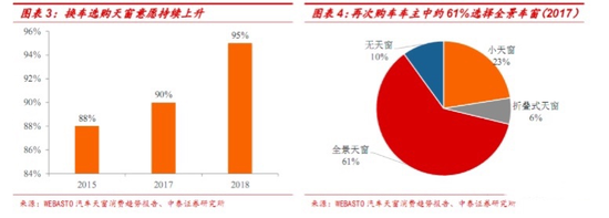 根据伟巴斯特的研究,顾客在购车时天窗考量占比为70%。对比2015年,2018年换车时考虑有天窗的用户增加了7%达到95%,且倾向于可开启的大尺寸全景天窗,全景天窗在消费中的关注度持续提升。