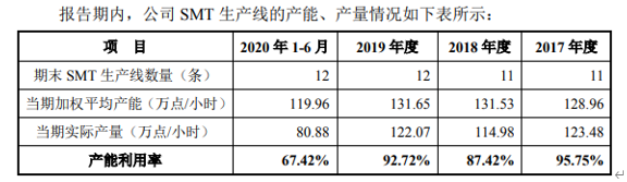 但另一方面,招股书第227页披露的“报告期内,公司SMT生产线的产能、产量情况”显示,公司并不存在产能瓶颈,相反今年上半年的产能利用率仅为三分之二;该公司在回复中也表示“公司2020年上半年的订单交付进度有所推迟,因此公司产能利用率有所下降”。这令人质疑,该公司在招股书中披露的“将有效缓解公司的产能瓶颈”,存在信息披露误导。