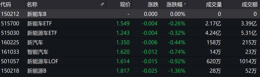 此外,新能源汽车板块早盘表现活跃,午后冲高回落,比亚迪(002594.SZ)、宁德时代(300750.SZ)等个股涨幅收窄。截至收盘,场内相关主题基金悉数飘绿。