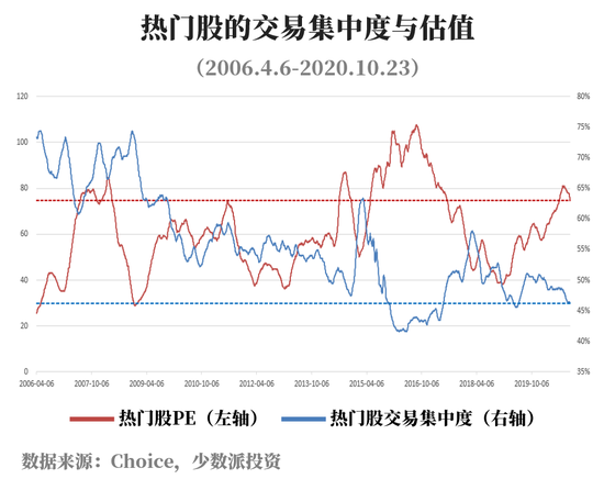 下图展示的是,从2006年初以来,截至上周五,热门股PE与交易集中度这两个指标的60日移动平均线。可以发现,二者自2013年后便呈现出一种较为明显的反向关系。