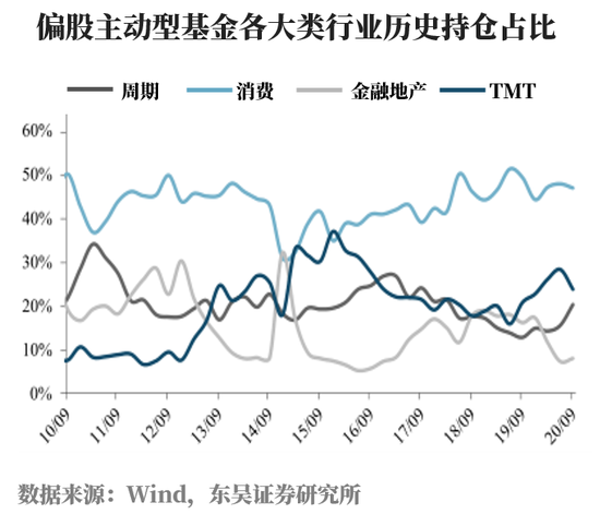 根据东吴证券的统计,周期板块持股市值占比从20Q2的15.6%提升至20Q3的20.4%;金融地产板块从7.5%提升至8.2%。消费板块持股市值占比则从48.0%下滑至47.1%;TMT板块从28.4%下降至23.9%。