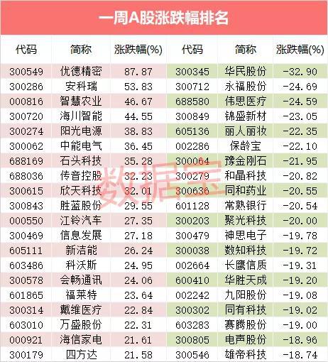 在过去的五个交易日里,哪些黑马股脱颖而出?证券时报·数据宝统计显示,剔除近一个月上市的次新股,本周涨幅前五位的是优德精密、安科瑞、智慧农业、海川智能、阳光电源。