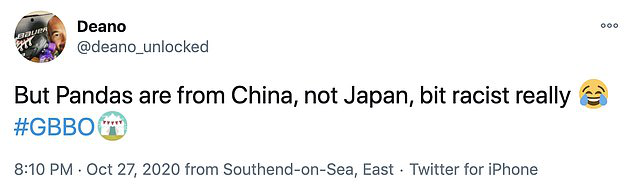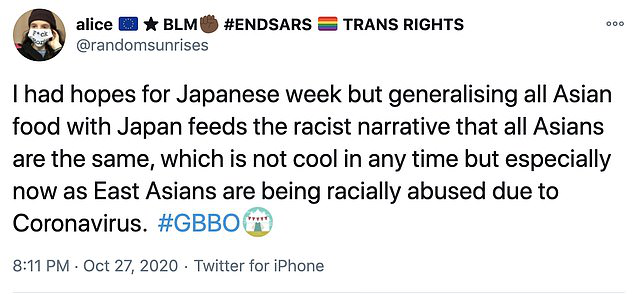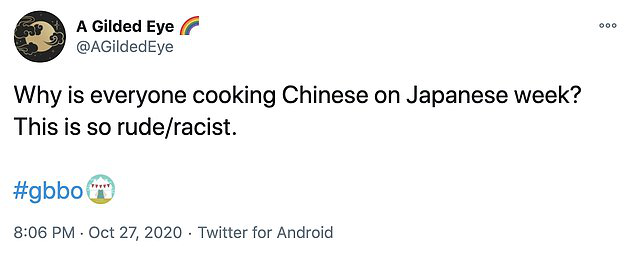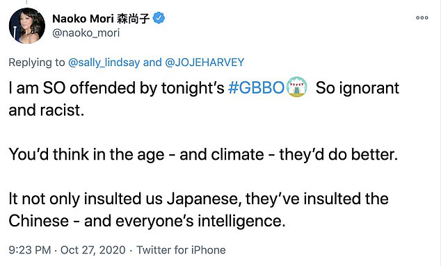 但有日本网友写道,“我被英国烹饪大赛今晚节目中如此无知和种族主义(的行为)冒犯到了……这不仅侮辱了我们日本人,他们也侮辱了中国人,还有每个人的智商。”