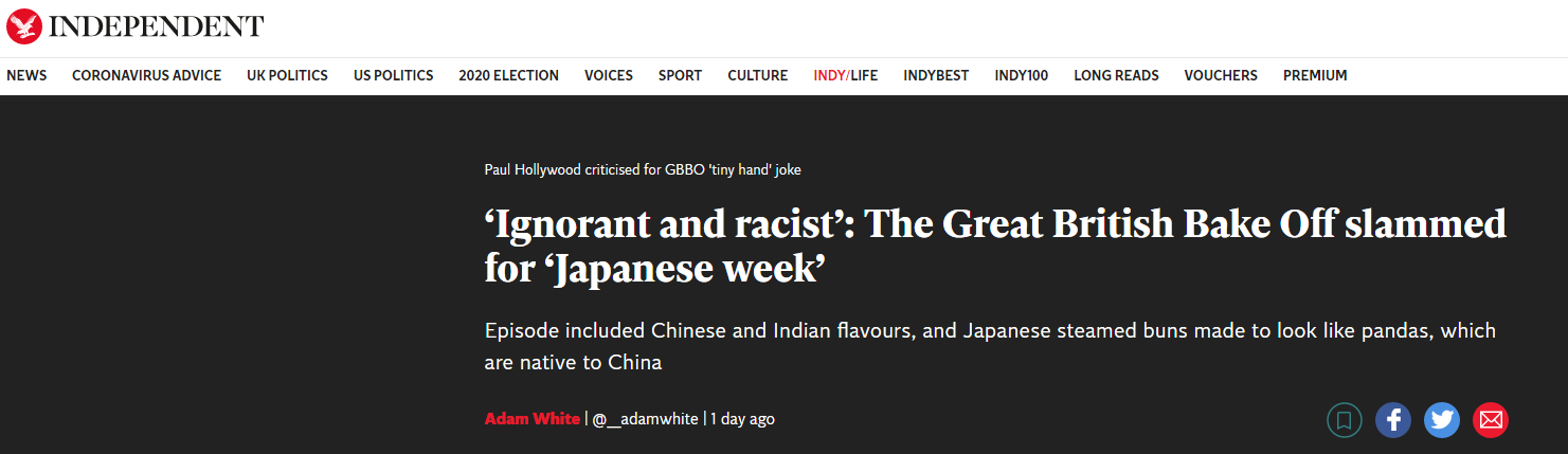 事情还要从27日的节目开始说起。据英国《独立报》、《每日邮报》等英媒报道,当天的节目中,参赛者的任务是为“日本周”制作美食。然而,他们所制作的食物却呈现出中国风和印度风,这引来不少网友的质疑。