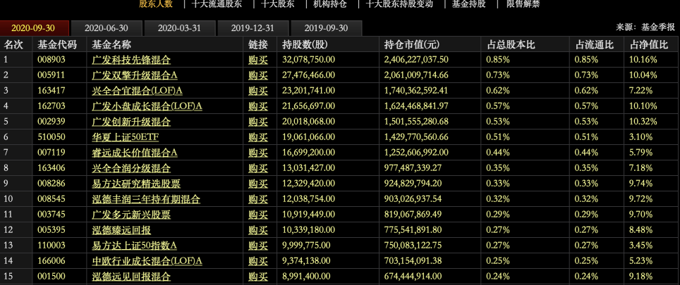 来源:Wind三季报中,机构、牛散的掘金路线纷纷显现。十大股东中,知名公募“一哥”刘格菘管理的两支基金上榜,其中广发双擎升级基金在三季度成为隆基新晋股东;“西部信托·陕煤-朱雀产业投资单一资金信托”退出,让陕煤成为大“赢家”;知名牛散陈发树为期两年的投资,浮盈或高达80亿元。
