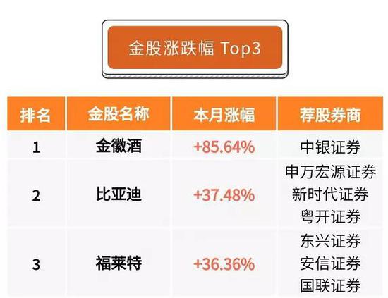 此外, 由中银证券推荐的金徽酒在10月累计上涨85.6%,在所有“金股”中排名第一;由申万宏源、新时代证券、粤开证券共同推荐的比亚迪也在10月表现不俗。