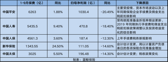 譬如中国平安(601318.SH),归母净利润1030.4亿元,同比下降20.5%;中国人寿(601628.SH)归母净利润470.8亿元,同比缩水18.4%;新华保险(601336.SH)、中国太保(601601.SH)、中国人保(601319.SH)归母净利润分别为111.05亿元、196.48亿元、187.4亿元,下降14.6个百分点、14.3个百分点、12.3个百分点。