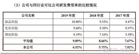 同期研发费用占营收的比例分别为7.82%、5.75%和6.52%,而同期同行业可比上市公司的研发费用率平均值分别为7.67%、8.66%和 9.89%,高于腾景科技。