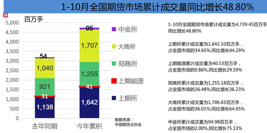 中国期货业协会最新统计资料表明,10月全国期货市场交易规模较上月下降,以单边计算,当月全国期货市场成交量为474,125,523手,成交额为331,585.70亿元,同比分别增长65.20%和57.04%,环比分别下降24.06%和27.83%。1-10月全国期货市场累计成交量为 4,739,449,557手,累计成交额为3,359,621.45亿元,同比分别增长48.80%和42.70%。