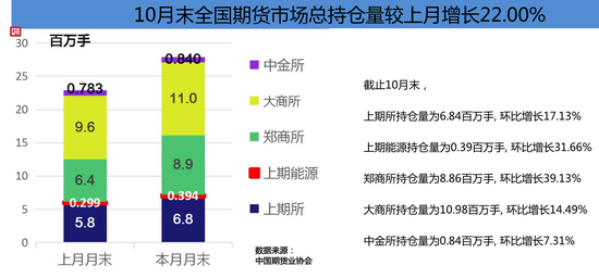 上海国际能源交易中心10月成交量为4,765,875手,成交额为8,160.46亿元,分别占全国市场的1.01%和2.46%,同比分别增长158.73%和1.82%,环比分别下降11.34%和17.48%。10月末上海国际能源中心持仓总量为393,518手,较上月末增长31.66%。1-10月上海国际能源中心累计成交量为40,530,570手,累计成交额为98,323.26亿元,同比分别增长29.59%和下降28.80%,分别占全国市场的0.86%和2.93%。
