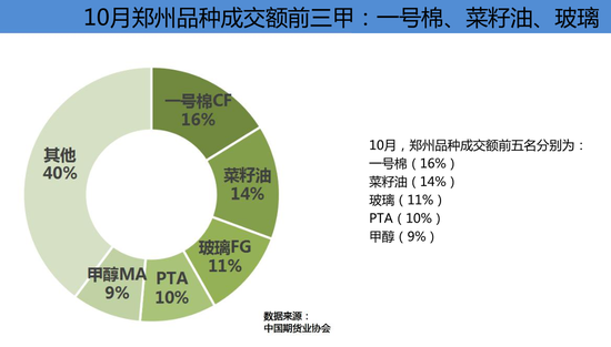 郑州商品交易所10月成交量为153,070,684手,成交额为55,815.65亿元,分别占全国市场的32.28%和16.83%,同比分别增长111.74%和105.67%,环比分别下降17.00%和18.46%。10月末郑州商品交易所持仓总量为8,863,485手,较上月末增长39.13%。1-10月郑州商品交易所累计成交量为1,255,179,724手,累计成交额为441,590.61亿元,同比分别增长36.23%和31.94%,分别占全国市场的26.48%和13.14%。