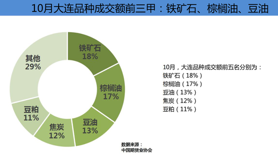 大连商品交易所10月成交量为173,411,378手,成交额为89,186.45亿元,分别占全国市场的36.57%和26.90%,同比分别增长65.71%和83.10%,环比分别下降22.26%和20.71%。10月末大连商品交易所持仓总量为10,979,779手,较上月末增长14.49%。1-10月大连商品交易所累计成交量为1,706,650,612手,累计成交额为798,267.69亿元,同比分别增长64.05%和49.54%,分别占全国市场的36.01%和23.76%。
