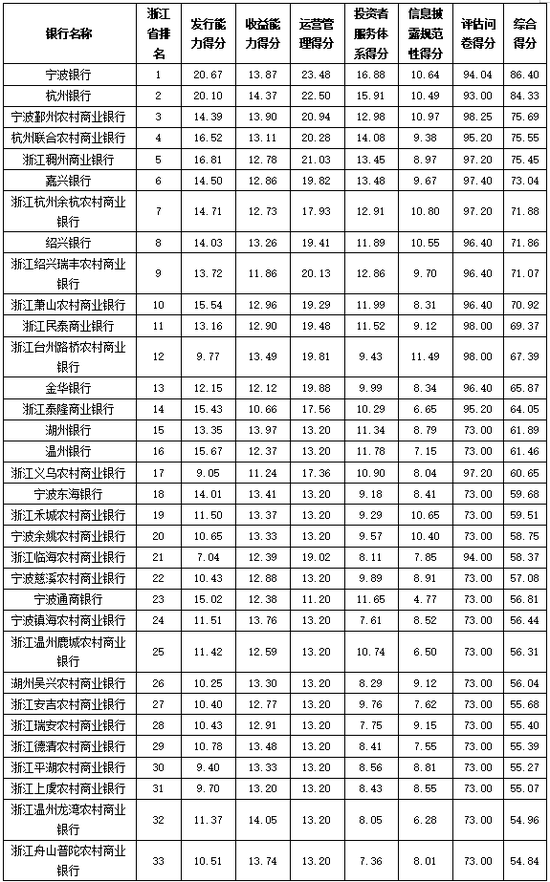 根据普益标准的评价结果,宁波银行位居浙江省区域银行综合理财能力第一名。各单项排名结果显示,宁波银行的发行能力、运营管理能力、投资者服务体系位居该省第一名;浙江丽水莲都农村商业银行的收益能力位居该省第一名;浙江台州路桥农村商业银行的信息披露规范性位居该省第一名。