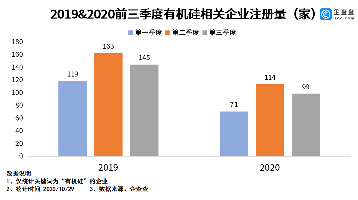 2020年前三季度,企查查数据显示,我国有机硅企业一共新注册了284家,同比下跌33.5%。其中,第一季度注册量是71家,第二季度114家,第三季度99家。
