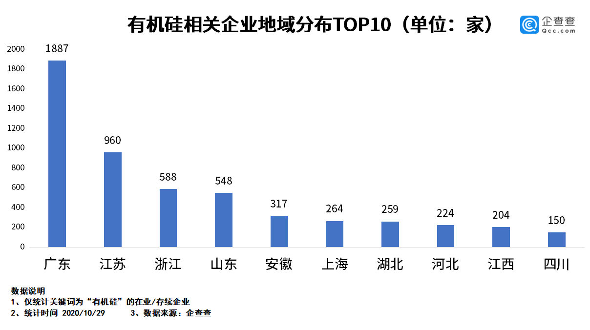 据企查查数据显示,截至目前,我国现存的有机硅相关企业一共有6510 家。从企业地区分布来看,我国有机硅相关企业大多分布在广东、江苏、浙江、山东等地。其中广东省企业数量位居全国第一,共有1887家。江苏省排名第二,共960家企业。山东省排名第三,共588家企业。此外,入围企业数量前十名的省份还有安徽、上海、湖北、河北等地。