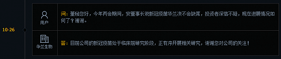 此外,界面新闻记者注意到,华兰生物的新冠疫苗研发进展缓慢,截至10月26日仍处于临床前研究阶段,目前A股上市公司康希诺(688185.SH)、智飞生物(300122.SZ)都已有相关疫苗产品进入临床三期。