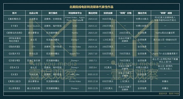院线电影“转网”势态良好的情况下,华纳兄弟将旗下的《女巫》放到HBO Max播出,迪士尼再将皮克斯的原创新作《心灵奇旅》上线Disney+,而迪士尼近期宣布将重组媒体和娱乐部门,把战略重点向流媒体业务倾斜。