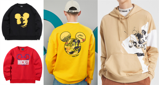 同样和迪士尼联名,中国李宁的设计就很讨巧:不一定把米奇直接印在衣服上。只选用米奇耳朵或剪影元素,或只把米奇红黑代表色拎出来就够了。