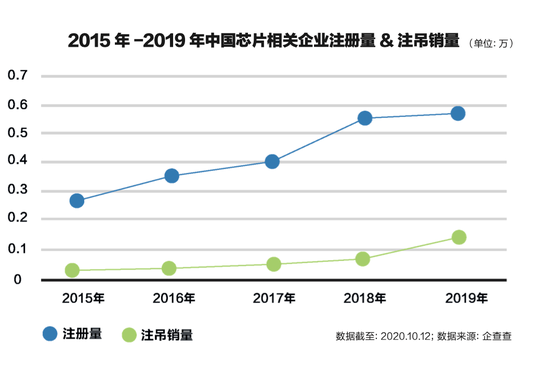 大约从2015年开始,全国各地出现造芯热潮。经过多年发展,中国的芯片相关企业也已经加入世界芯片企业前列。2015年至以来的五年内,芯片相关企业注册量整体呈上升趋势,企查查数据显示,2015年共注册0.28万家,2018年是五年来相关企业注册量增长速度最快的一年,共新注册0.55万家,同比增长34.1%。2019年共注册0.58万家。同时,五年来相关企业注吊销量整体平稳递增,2019年的注吊销量最多,为0.14万家。