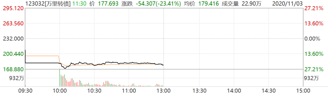 今天上午,万里转债盘初跌逾20%触发“熔断”,复牌后一度跌超27%。