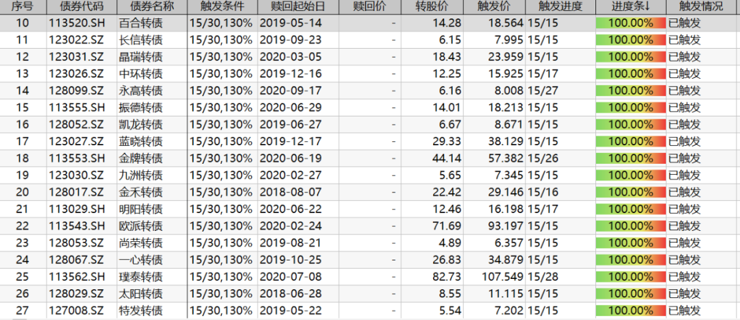 此前被炒高而如今大幅回落的转债中,不少已经满足强赎条款,例如百合转债、凯龙转债、九洲转债、尚荣转债、特发转债等,投资者须关注强赎风险。