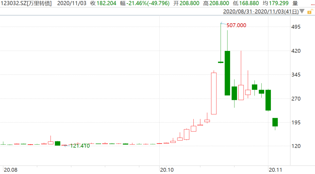 本周以来,万里转债连续大跌,11月2日跌近19%,跌幅居前;3日上午又跌逾23%。本周以来已经跌去约107元市价。