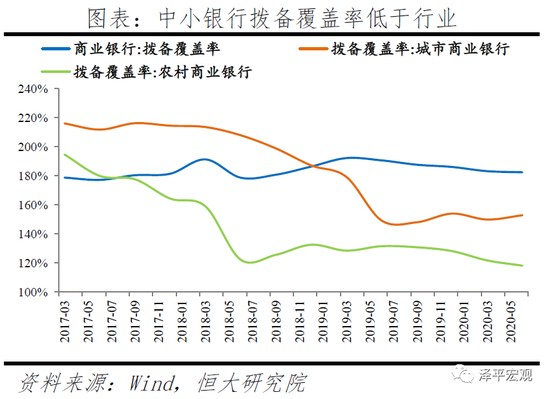 2019年以来,中小银行不良贷款比例持续提升,高于行业平均水平,拨备覆盖率显著下降,低于行业整体水平。截至2020年6月末,行业不良率为1.94%,较2018年提高11bp,而城商行不良资产率已达2.3%,较2018年底提高51bp,农商行不良率达到4.21%,较2018年末提高25bp。