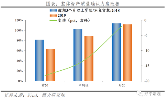 部分中小银行存款基础薄弱,存款规模负增长。2019年共有4家城商行存款规模出现负增长,最高降幅达16.2%。存款占比排名前20的城商行,凭借区位及深耕地方优势,平均存款占比达88.2%,负债端稳定,而存款占比排名后20的城商行,则平均存款占比仅为60.5%,仍需大量依靠同业业务进行主动负债,受金融市场波动影响较大。