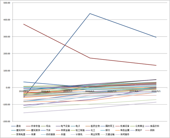 农林牧渔高达296.83%和130.79%,国防军工、建筑材料、建筑装饰、汽车净利润增速在三季度出现转正,同时需要注意的是通信、农林牧渔虽然仍维持高增速,但同比增速分别收窄139.53%和43.44%。