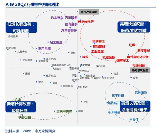 申万宏源认为,上中游原材料与可选消费板块成为三季度A股业绩上行核心动力,为了便于清晰刻画当前各个行业基本面所处的景气特征从而便于横向对比,选取重点申万一二级行业,并按照绝对景气程度(营收和利润增速两个维度)和近期改善程度(营收和利润增速两个维度)进行排序。可以看出当前行业比较排序中占优的板块主要是高增长强改善的医药和中游制造和低增长强改善的可选消费板块。结合三季度各行业当前景气度所处定位来看,相较于当前景气度已经处于历史高位的医药和部分中游设备类行业,景气底部回升的可选消费更值得重点关注。