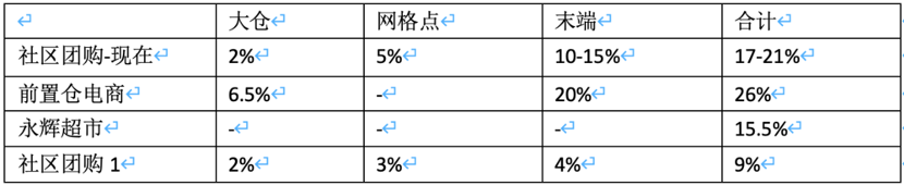 从履约角度看,客户上门的履约成本比送上门的前支撑要低。其中社区团购的网格点和末端都是按单提成。其中网格点按每单0.4-0.5元,末端按单量给予阶梯提成,通常占到10-15%。