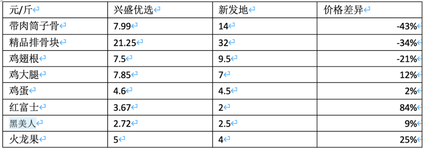 对比社区团购与新发地批发的最低价格,不难发现其冻品的零售价格比批发价格还低,对比其他零售则非常具有吸引力,而只有水果还保持有相对正常的加价率。