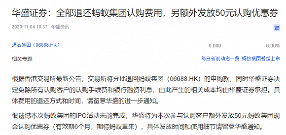 华盛证券方面向界面新闻回应称,公司决定免除所有认购客户的认购手续费和银行融资利息,由此产生的相关成本均由华盛证券承担。具体费用的退还方式和时间,请留意华盛的进一步通知。此外,华盛将为本次参与认购客户额外发放50元蚂蚁集团现金认购优惠券(有效期6个月)。