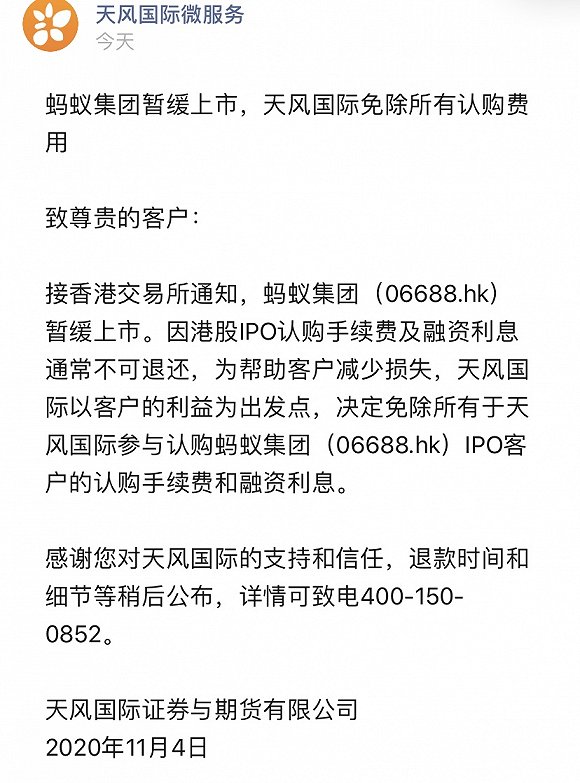 天风国际也公告称,免除所有参与认购蚂蚁集团IPO客户的认购手续费和融资利息。