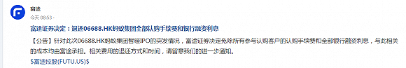 作为一家主要针对港美股的互联网券商,富途证券向界面记者回应称,针对此次06688.HK蚂蚁集团暂缓IPO的突发情况,富途证券决定免除所有参与认购客户的认购手续费和全部银行融资利息,与此相关的成本均由富途承担。“相关费用的退还方式和时间,请留意我们的进一步通知。”