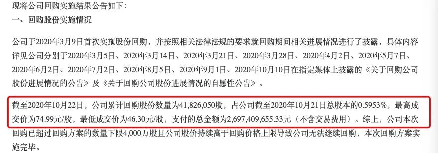10月23日,美的集团公告透称,截至10月22日,公司累计回购股份数量为4182.61万股,占公司截至2020年10月21日总股本的0.5953%,最高成交价为74.99元/股,最低成交价为46.30元/股,支付的总金额为26.97亿元(不含交易费用)。