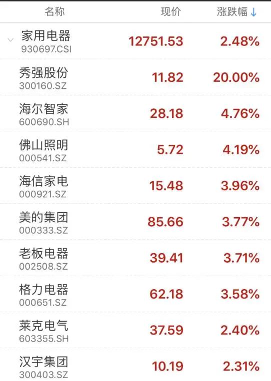 此外,家电板块集体走强,截至收盘,家用电器板块指数上涨2.48%,秀强股份(维权)封涨停、北鼎股份涨8.45%、汉宇集团涨2.31%、老板电器涨3.71%。