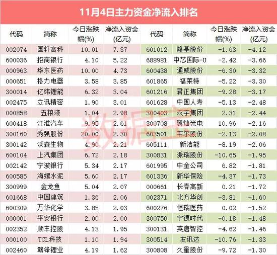 单只股票来看,共有32只个股主力资金净流入超亿元,国轩高科主力资金净流入7.37亿元,净流入规模最高。国轩高科今日放量涨停,盘中几次打开涨停板,收盘时涨停板封单不算太多,仅5442手,约合资金0.16亿元。国轩高科是国内最早从事新能源汽车用动力锂离子电池(组)自主研发、生产和销售的企业之一。今年前三季度,公司净利润为0.85亿元,同比下滑85.26%。业绩变动主要是受新冠疫情影响,下游新能源汽车销量大幅下滑;同时因市场竞争加剧以及下游新能源汽车补贴退坡,动力锂电池产品平均销售价格比上年同期有所下降。