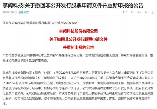 值得注意的是,该定增方案一直没有落地。8月份,掌阅科技发布撤回非公开发行股票申请文件并重新申报的公告,公告中称,公司于2020年3月17日公告了2020年非公开发行A股股票发行方案,后续积极推进申报、反馈回复、监管沟通等各项工作,根据再融资及战略投资者认定等相关政策,经与中介机构等充分沟通和审慎论证,公司决定申请终止本次非公开发行事项,撤回非公开发行股票申请文件。公司各项业务正常经营,本次非公开发行申请终止事项不会对公司正常经营与持续稳定发展造成重大影响,公司将结合监管政策、资本市场情况、公司战略规划及发展需求等因素,修改、调整再融资方案并重新申报。