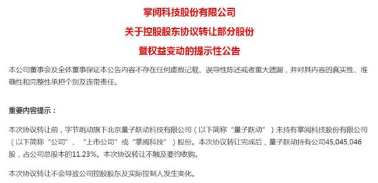 掌阅科技公告,公司控股股东、实际控制人成湘均、张凌云与量子跃动签订了《北京量子跃动科技有限公司与张凌云、成湘均关于掌阅科技股份有限公司之股份购买协议》及补充协议,成湘均和张凌云拟将其分别持有的2252.25万股、2252.25万股无限售流通股份协议转让给量子跃动。量子跃动是字节跳动的子公司,字节跳动持有其100%的股权。交易完成后,量子跃动持有公司4504.50万股,占公司总股本的11.23%。