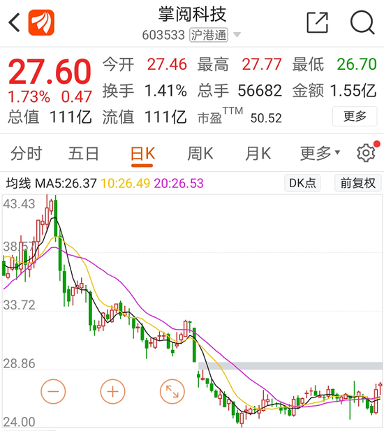 7月以来,掌阅科技股价已经从最高的43.43元跌至27.60元,跌幅高达36.45%。先是百度后是字节,这家数字阅读龙头公司经过一番资本运作后,能否顺利搭上互联网巨头的高速列车推动业务快速发展,市场各方拭目以待。