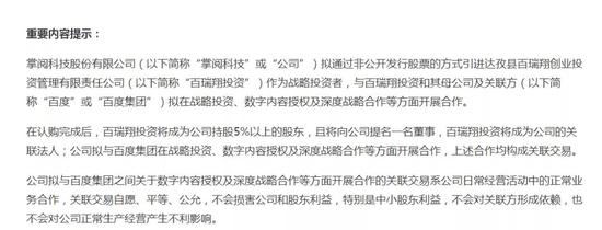 今年3月份,掌阅科技曾公告,拟通过非公开发行股票的方式引进达孜县百瑞翔创业投资管理有限责任公司(以下简称“百瑞翔投资”)作为战略投资者,与百瑞翔投资和其母公司及关联方(以下简称“百度”或“百度集团”)拟在战略投资、数字内容授权及深度战略合作等方面开展合作。