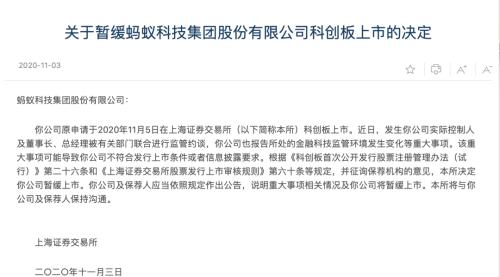 11月3日晚间,上交所发布《关于暂缓蚂蚁科技集团股份有限公司科创板上市的决定》(以下简称《决定》)。