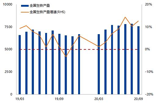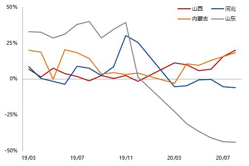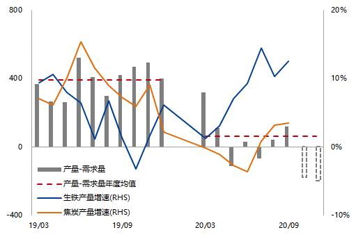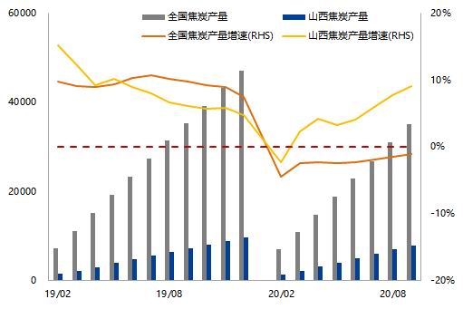 2020年前三季度焦炭累计产量下降350万吨,同比增速-1.0%,而同期生铁累计产量增加5345万吨,焦炭供需缺口已然产生。具体来看,二季度山东力推“以煤定产”实施方案,通过化解过剩煤炭产能推动当地焦化行业升级改造,落后焦化产能的一次性出清造成当地短期供应缺口的产生,焦炭产量出现区域性紧张局面;下游方面,疫情管控成效初显后,经济复苏成为国内政策制定的主旋律,生铁产量受此影响不断攀升,焦炭真实需求持续旺盛,整体供需缺口则难以回补。